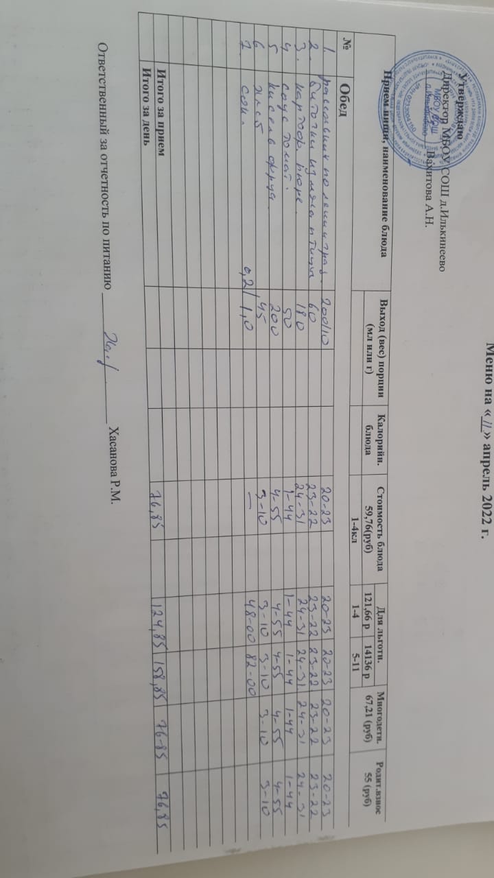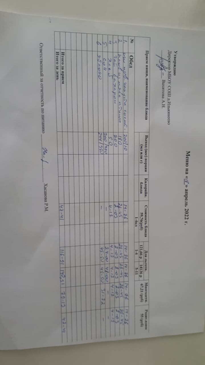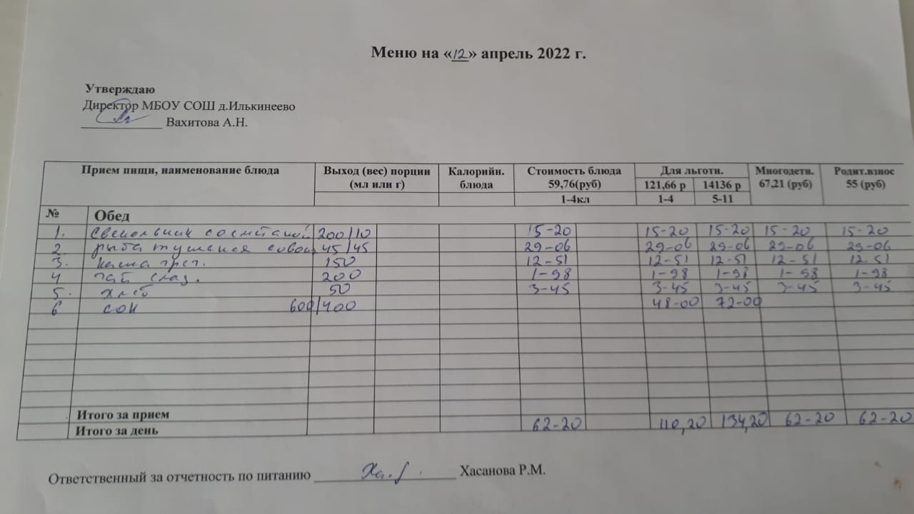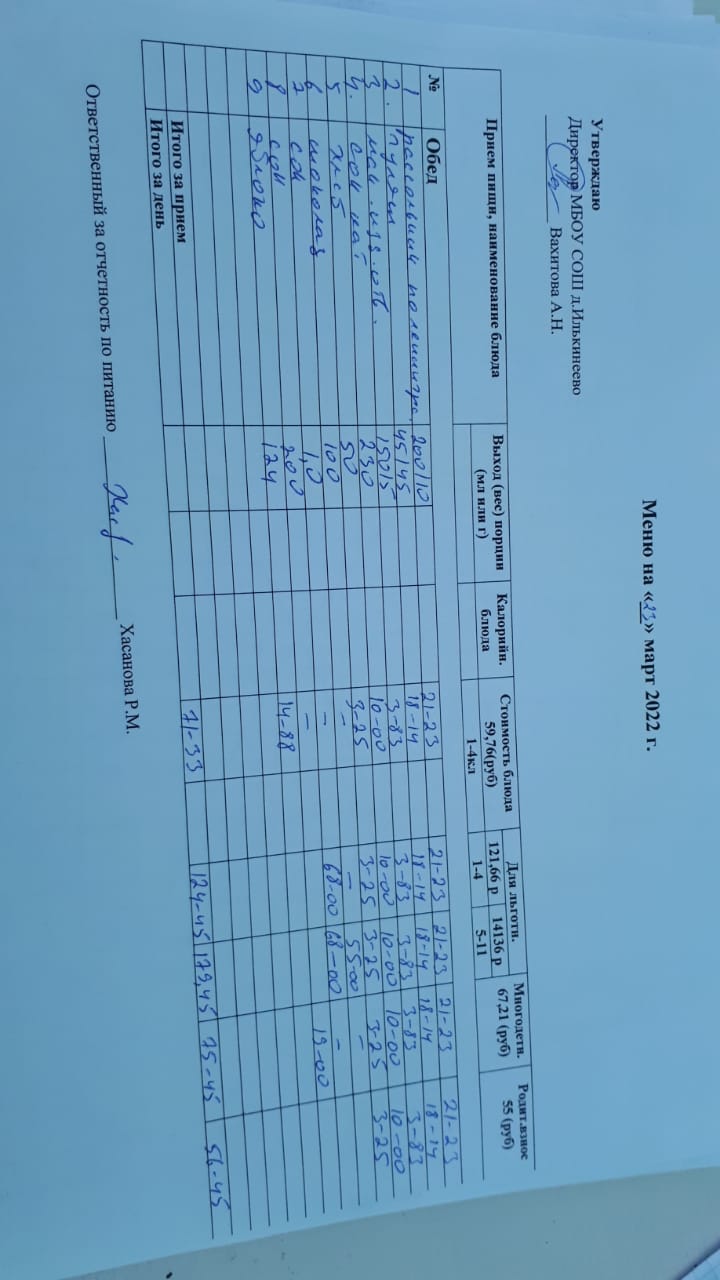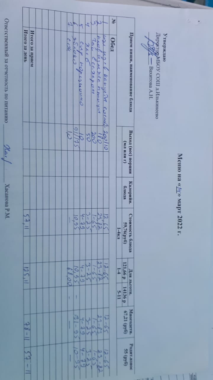 Меню 1-4 классов